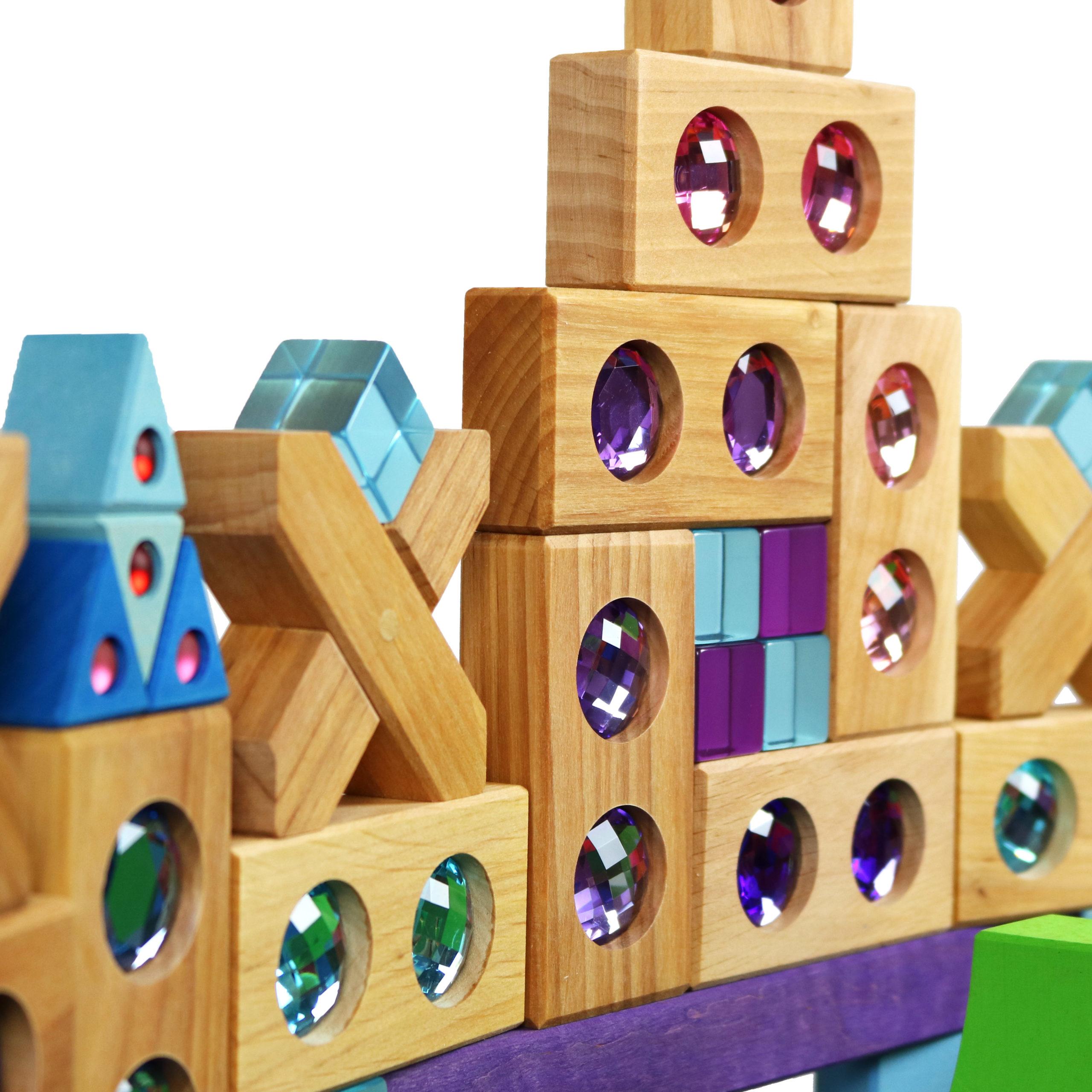 45 Teile, aus Erlenholz, geölt Kasten: 52 x 32 x 12 cm, Quader: 10 x 5 x 2,5 cm Funkelsteine: Ø 3 cm