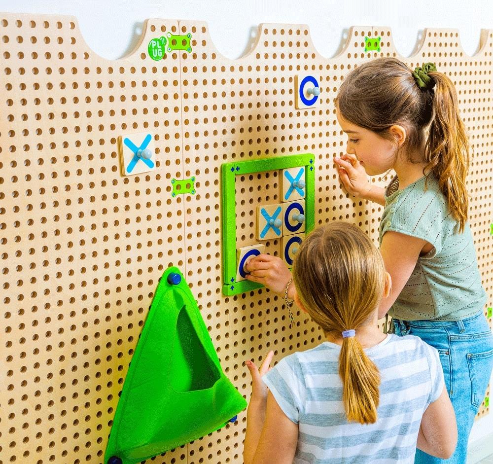Mit dem PLUG it "Tic Tac Toe und Steckspiel Set" kommt nicht nur der beliebte Spieleklassiker an die Wand, sondern vor allem eine riesige Auswahl an Farb-Plugs zum Stecken von Bildern. Ein grüner Holzrahmen begrenzt das Spielfeld und dient als Wechselrahmen für die beiden doppelseitig bedruckten Folien für die Steckbilder. Die Kinder können so mit den 155 bunten Spiel-Plugs die Muster nachstecken oder die 4 Holz-Vorlagekarten nutzen, um frei an der Wand ein Muster zu stecken. Dieses Set bietet viele Spielmöglichkeiten für erstes Coding. Hiermit beschäftigt sich ein Kind entweder konzentriert allein, um Muster zu erkennen und die Feinmotorik zu schulen, oder eine Gruppe entwickelt komplexe Steckbilder über die ganze PLUG it Wand. Mit der praktischen grünen Filztasche lassen sich die Plugs ganz bequem aufräumen und an der Stelle anbringen, an der gespielt wird.