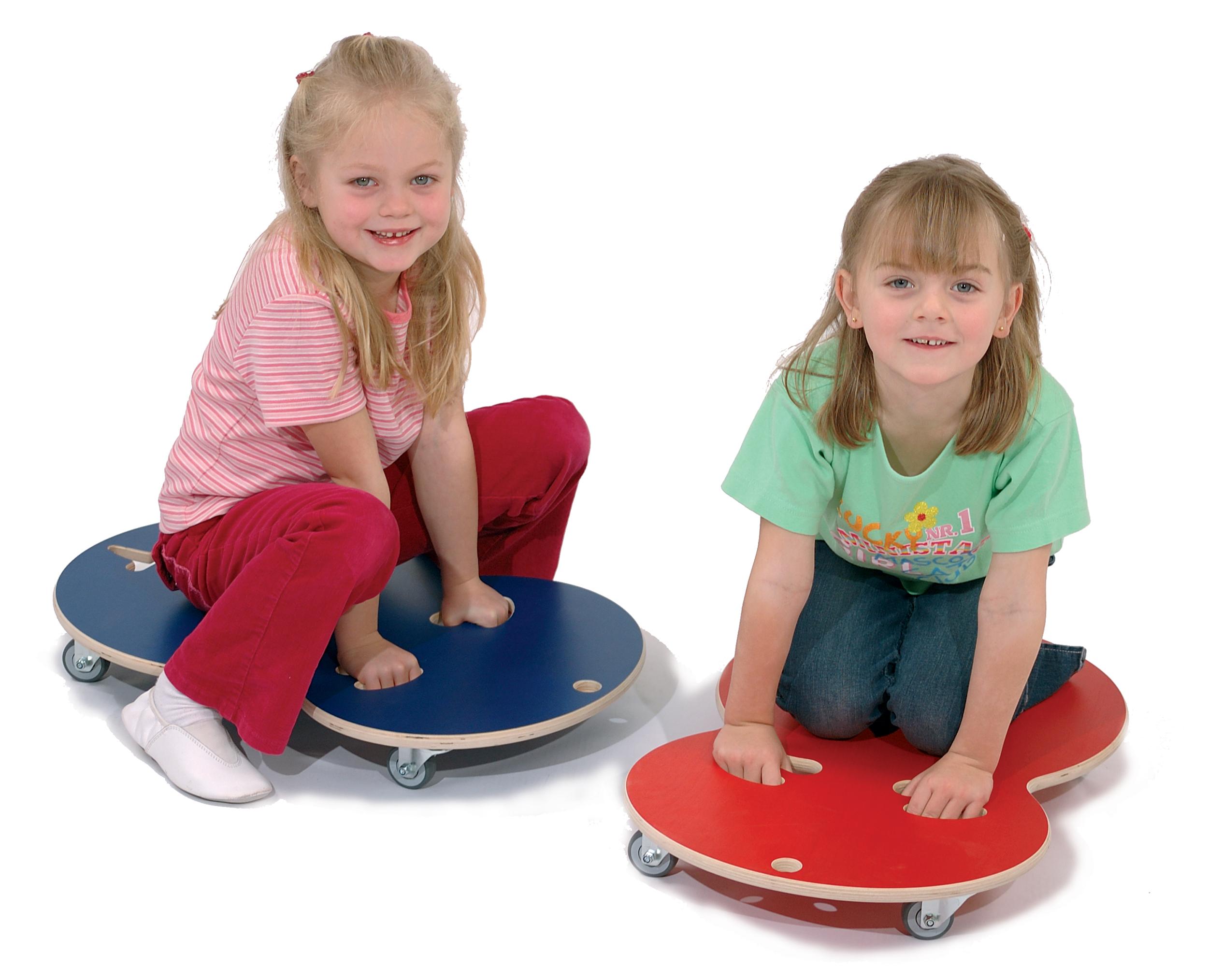 Rolletti-Rollbretter, 63 cm x 40 cm, aus Birken-Schichtholz, blau oder rot lasiert, in ausgefallener, abgerundeter Form mit praktischen Eingriffen für die Hände. Bodenabstand 8,6 cm.