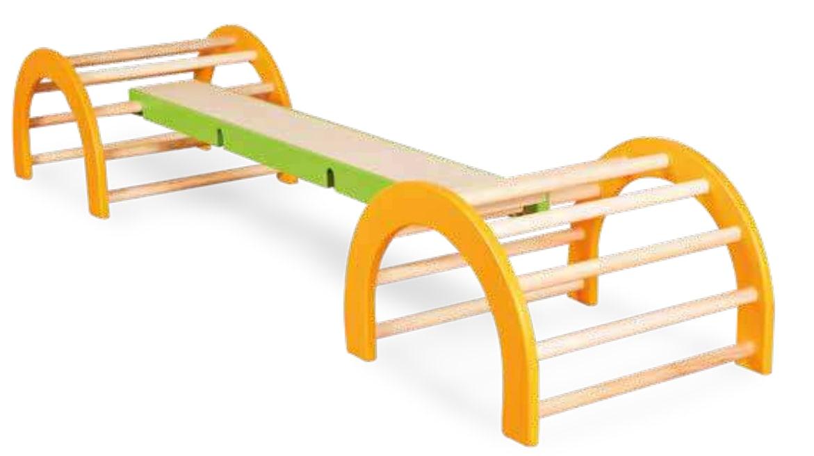 Die beiden Klettertunnel sind 58 × 58 × 40 cm, das Balancier-/Wippbrett ist 150 cm lang, 20 cm breit und mit 2 Sitzen versehen.