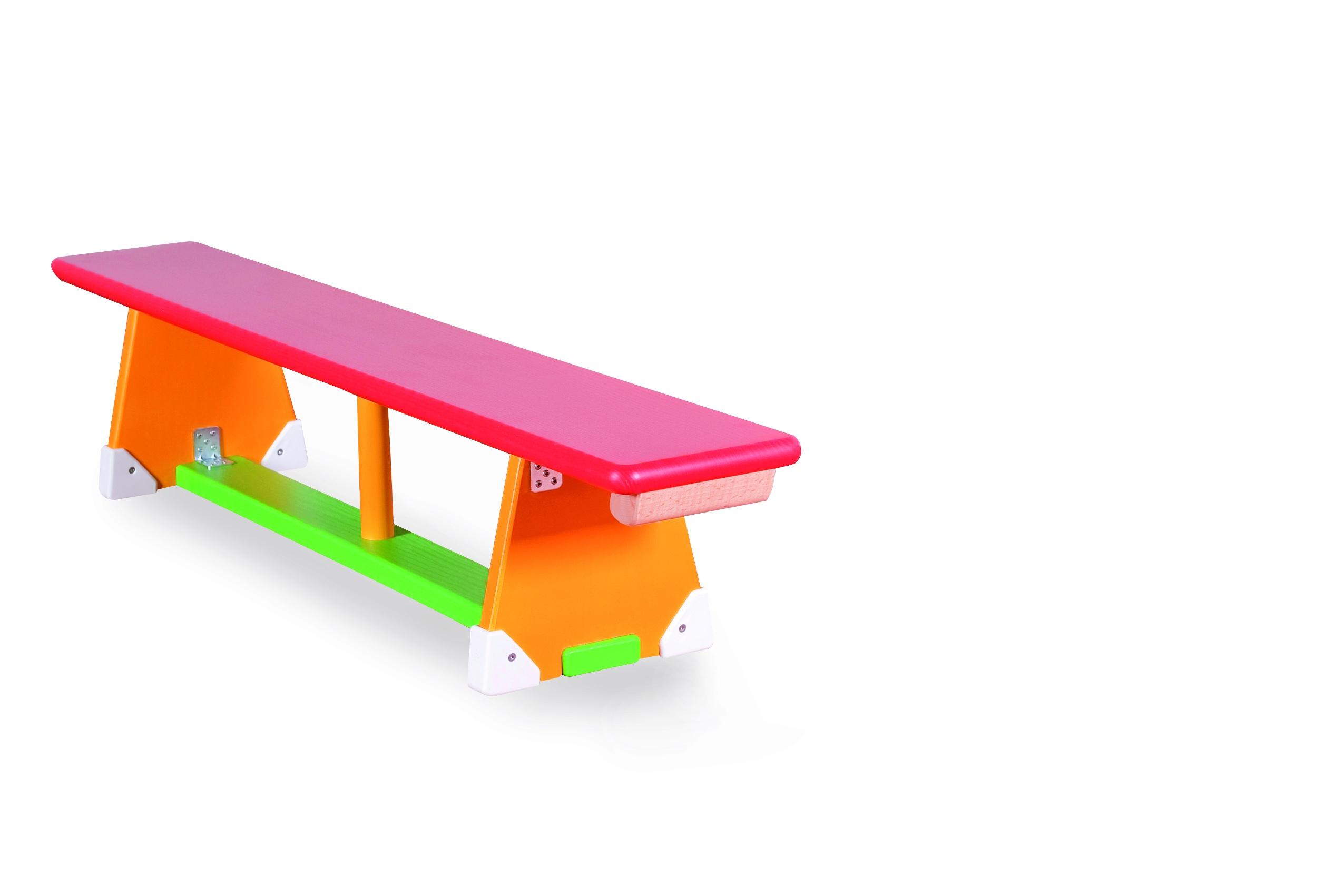 -schmale Turnbank -bunt: Sitzfläche rot, Füße gelb, Laufbalken grün -Breite: 24 cm -Höhe: 31 cm -Länge: 2,80 m