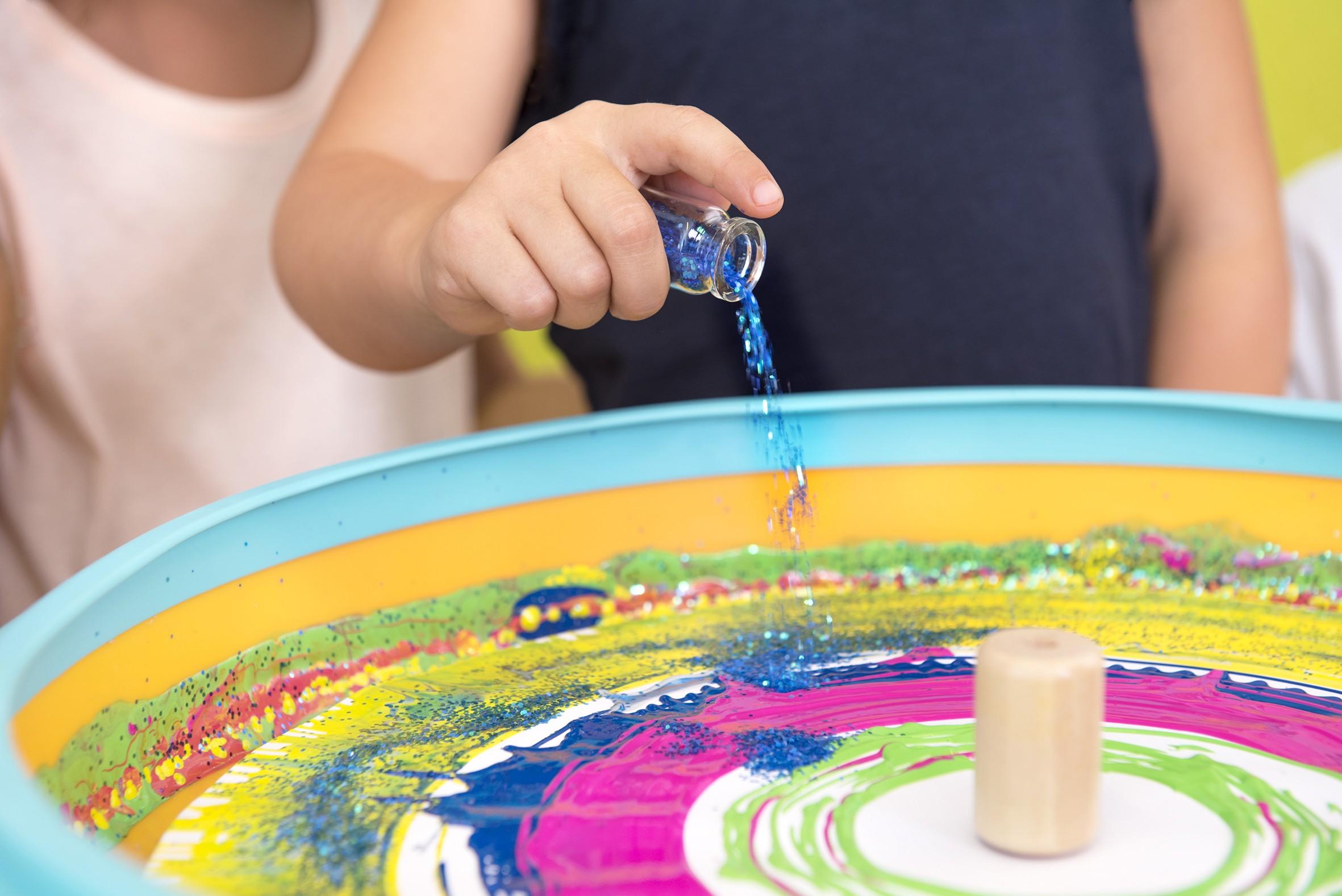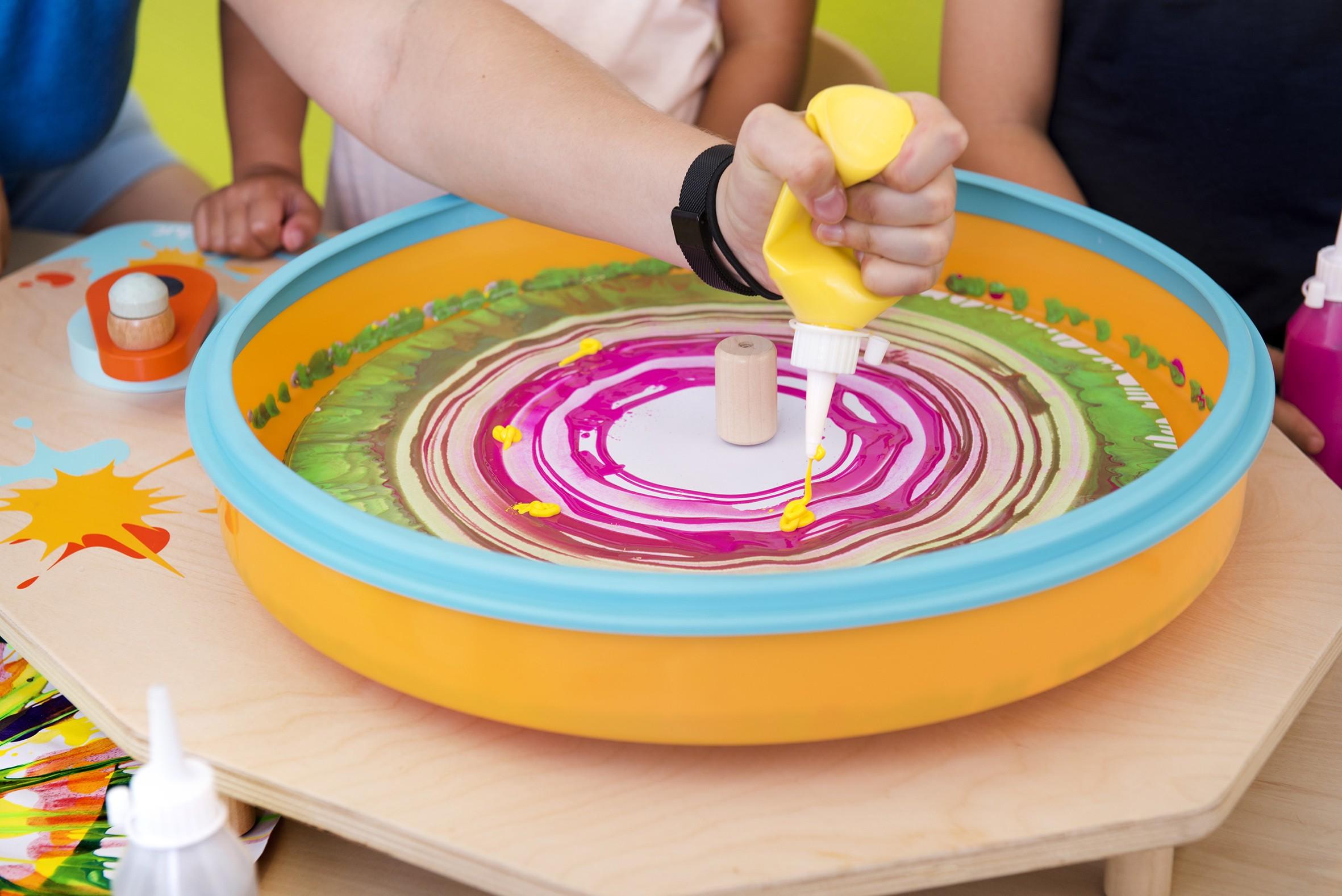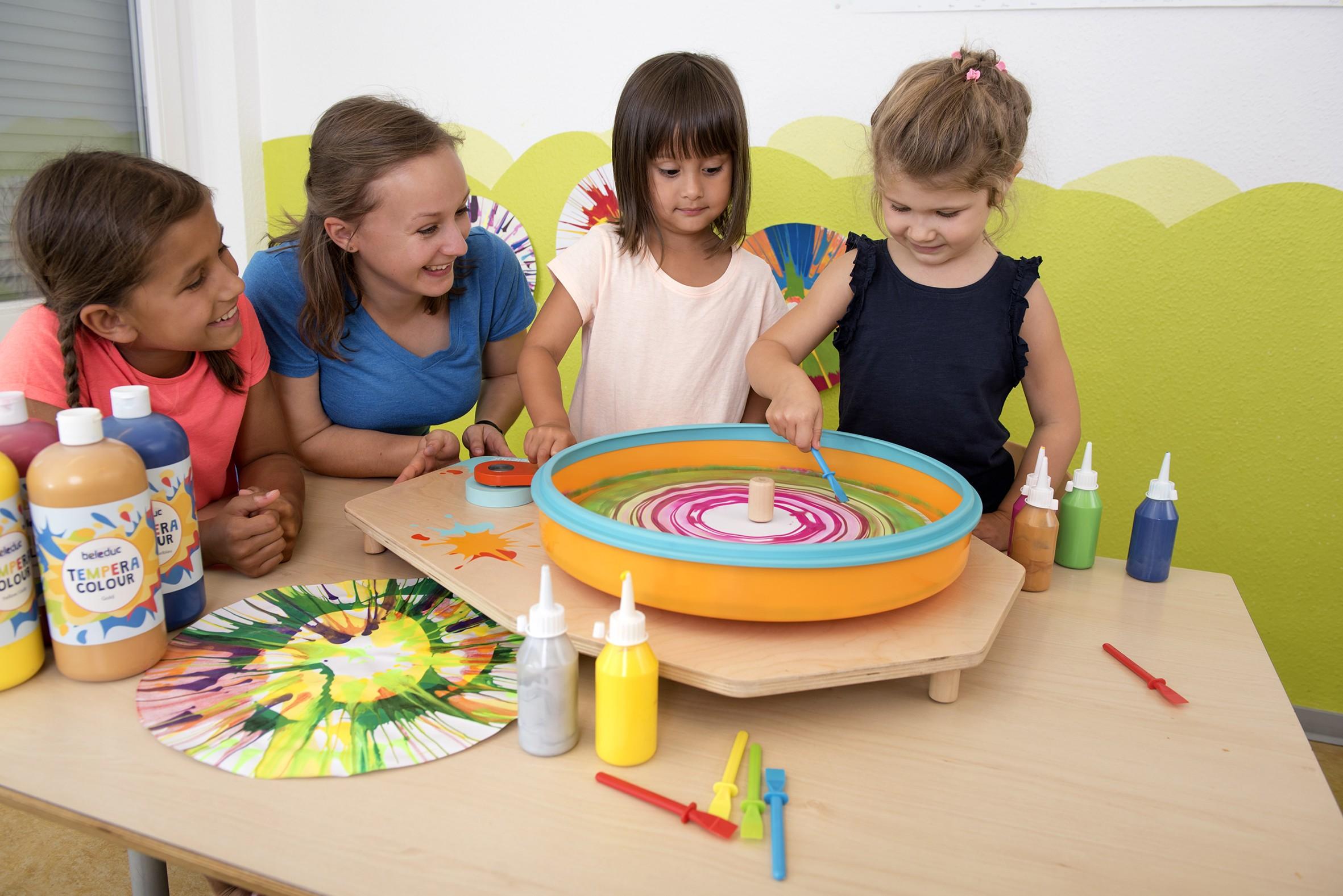 Mit der Farbenschleuder lassen sich auf einfache Art und Weise ausdrucksstarke und dynamische Bilder zaubern. Die Kinder können durch langsames oder schnelles Drehen mit der Kurbel die Entstehung des Kunstwerks beeinflussen. Vor oder beim Drehvorgang wird einfach Farbe auf das Papier gegeben und die Fliehkraft lässt tolle Muster entstehen.| Artikelnummer | 62034 |