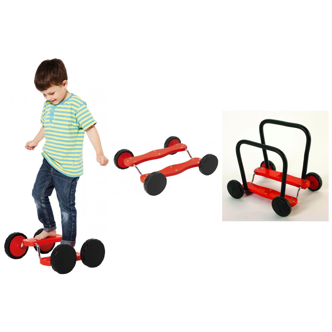 Solide und belastbare Ausführung, für den Einsatz in Kinderinstitutionen qualitativ weiterentwickelt, ohne scharfe Kanten und Klemmzonen. Trittbrett aus Kunststoff, Kunststoffräder mit Gummireifen. Für kleine Kinder können 45 cm hohe Handstützen montiert werden. Für das gemeinsame Spiel von zwei Kindern ist das eine zusätzliche Herausforderung, weil Kinder ihre Bewegungen koordinieren müssen.
