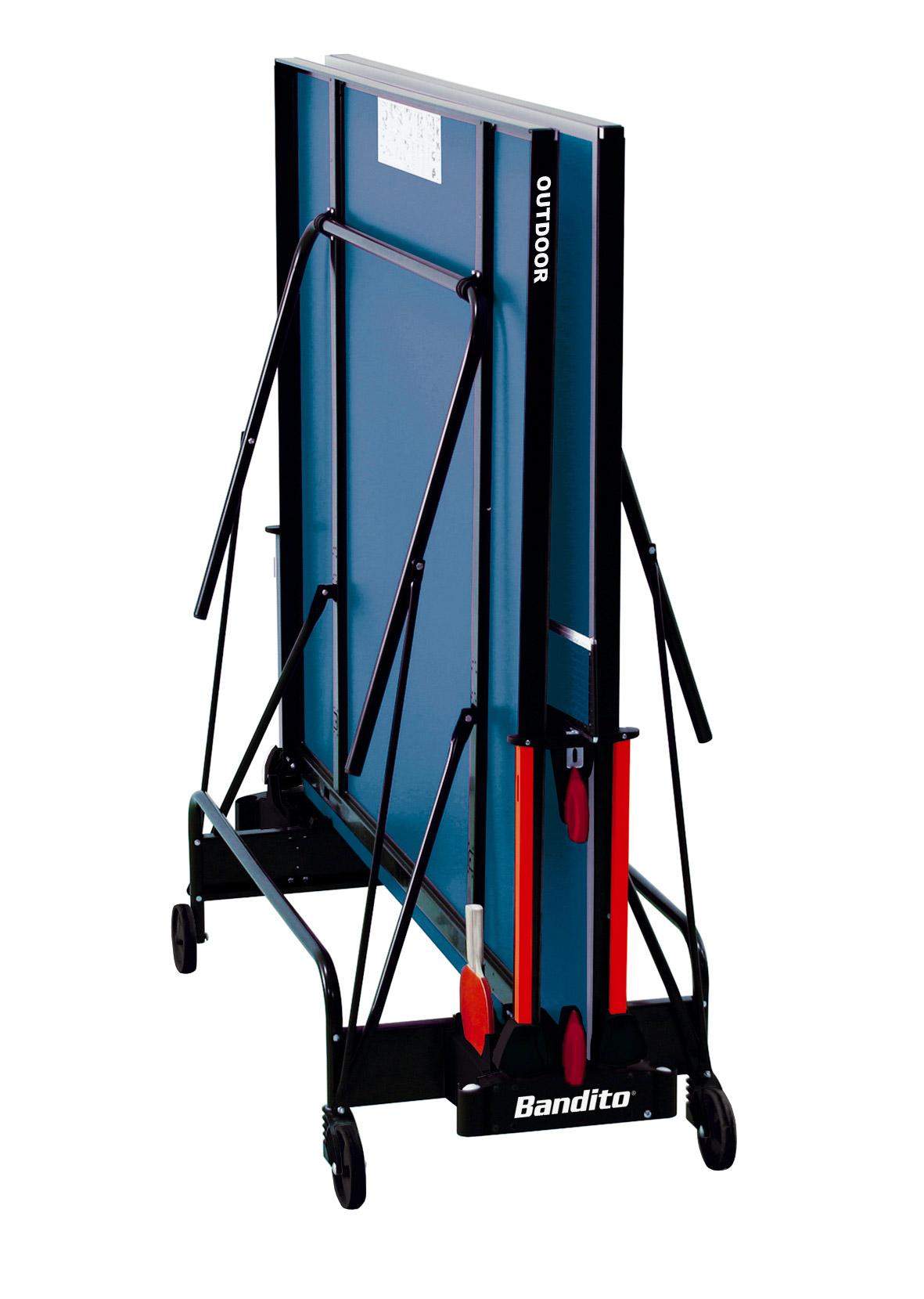 Die 4 Millimeter starke, schlagfeste Melaminharzplatte ist zusätzlich mit einer 36 Millimeter starken Metallunterkonstruktion fest verbunden. Die Platte ist absolut unempfindlich gegen Feuchtigkeit sowie resistent gegen heiße Temperaturen und Sonneneinstrahlung. Aufgrund der speziellen Eigenschaften, wie Plattenstärke, Rotationseffekt sowie Gleitreibungs- und Abriebfestigkeit ist die Platte im Punktesystem mit "1" bewertet. Das äußerst stabile Rundrohrprofil des Untergestells ist 25 Millimeter stark und rostsicher pulverbeschichtet. Das Ein- und Ausklappen des Tisches erfolgt mittels einfacher Drehgriff-Variante, die über einen Einrastmechanismus verfügt. Besonders praktisch ist das damit verbundene, neu entwickelte Ein-Personen-Aufklappsystem. Äußerst nützlich sind die seitlich angebrachten Halterungen für je vier Bälle und zwei Schläger. Der Bandito Turnier ist TÜV-geprüft, entspricht in den technischen Daten der EN-Norm 14468-1 und zusätzlich bereits der neuen EU-Norm "Kindersicherer Einstiegsschutz".